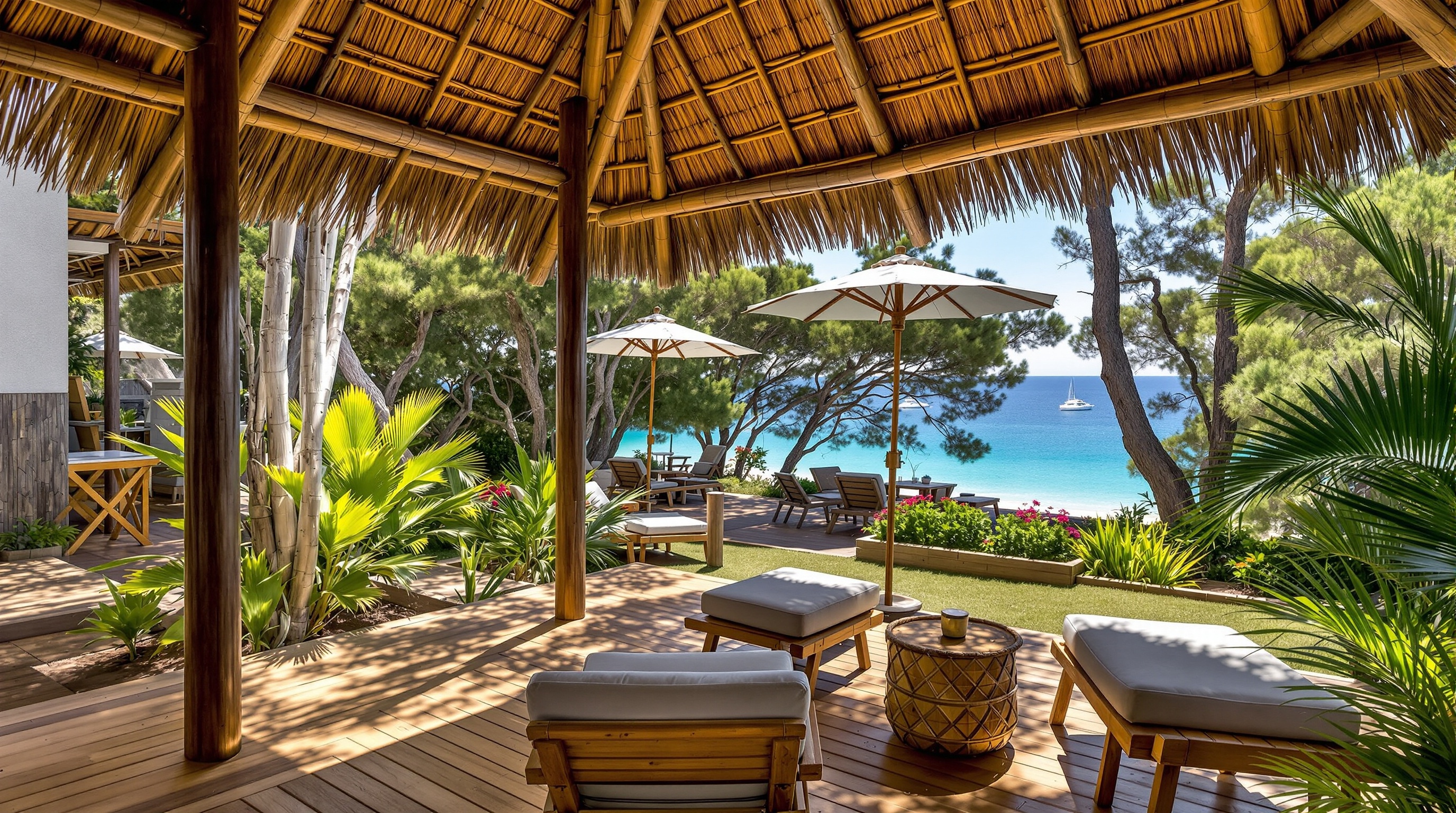 Marmaris İçmeler'de 120 bungalov içeren tatil köyünün tüm çatı ve gölgelik uygulamaları. Her bungalov için özel bambu çatı tasarımı yapıldı.