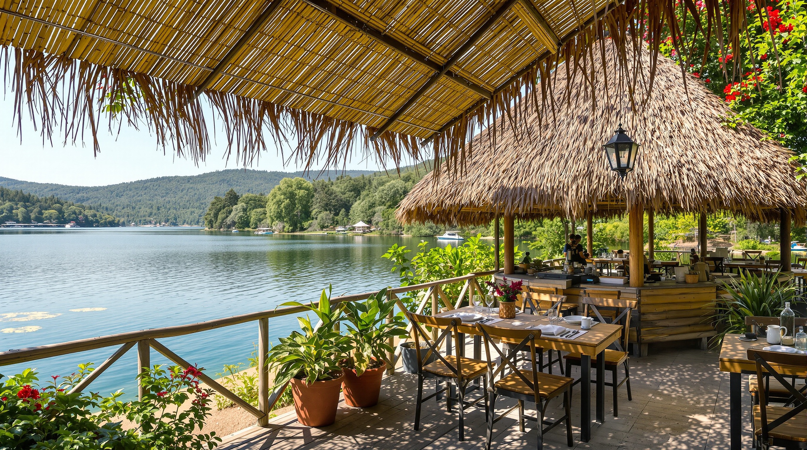 Sapanca Gölü kıyısında konumlanan cafe ve restoranın tüm dış mekan uygulamaları. Doğal ortamla uyumlu bambu ve sazlık hasır ile özgün bir atmosfer yaratıldı.